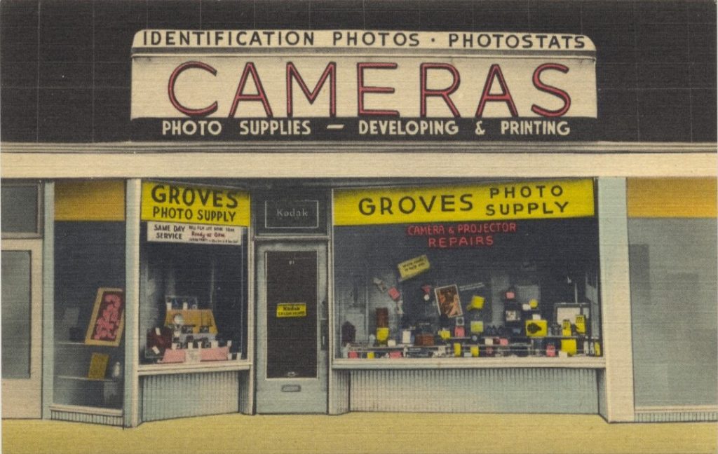 While there are storefront photos that are taken at varying angles, the straight-on cards generally pack an incomparable visual punch. They often have great symmetry and naturally have the color and sharpness that can be found on the best linen postcards. Some of them also feature the deco look that was popular in 1930s storefronts.