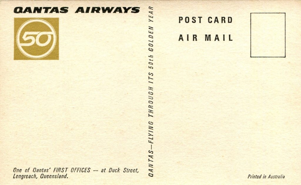Naturally, what caught my attention was the unusual color. After half-a-lifetime of collecting, these are the first “gold” postcards I have ever seen, but on closer examination the idea is quite appealing. Stated in brief, the Qantas Airways Corporation celebrated its Fiftieth (its GOLDEN) year in business by publishing a set of gold postcards.