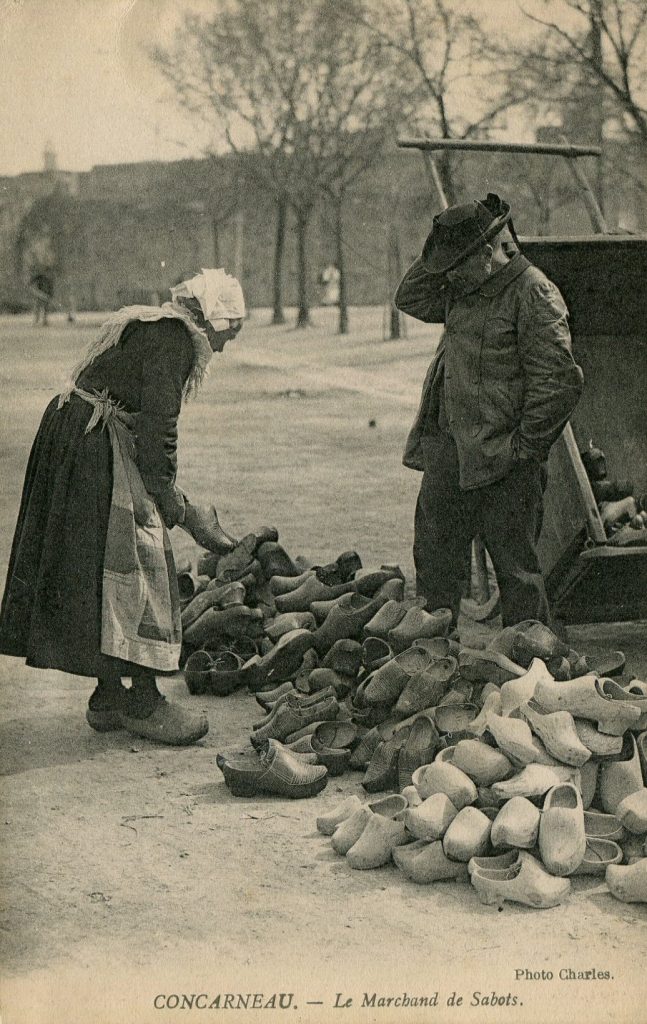 Sabot (wooden shoe) merchant from Concarneau, a village in Brittany in westernmost France.