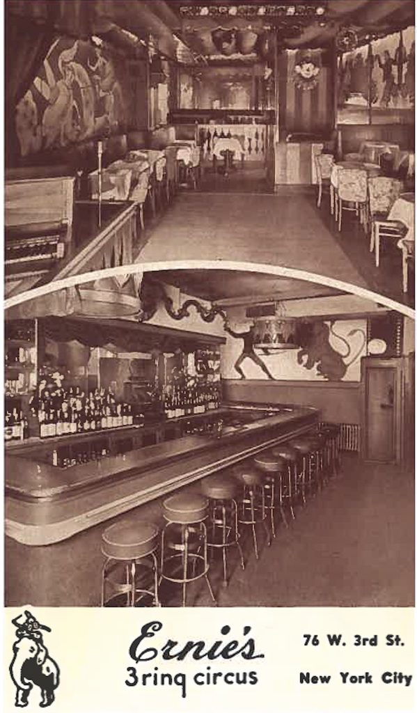 The Times They Are A-Changin’ for free in Washington Square Park during the day and then bringing their admirers back at night to clubs like the Bitter End, the Village Gate, and Café Wha?. Sometimes the nightspots themselves were art works like Ernie’s 3-ring Circus filled with table-side graphics and murals.
