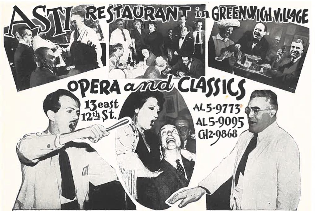 Greenwich Village was so overpopulated with out-of-town guests that its nightspots made special efforts to make everyone feel welcomed. Intimate piano bars and places like Asti allowed visitors to belt out their versions of the standards. The Village Barn, no doubt the neighborhood’s most prolific postcard producer, made it clear that tourists from “flyover country” also had a home in this quirky corner of the Big City.