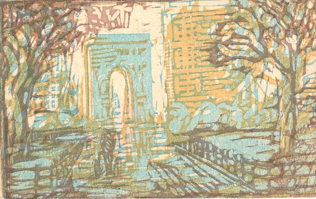 Another notable artist is the Viennese immigrant Leon Louis Dolice (1892-1960) whose absorption into various mid-century artistic movements are revealed in several sets of postcards that he authored. This linoleum-cut focusing on Greenwich Village’s iconic Washington Square Arch shows the influence of Abstract Expressionism in his interpretation of the streetscape.