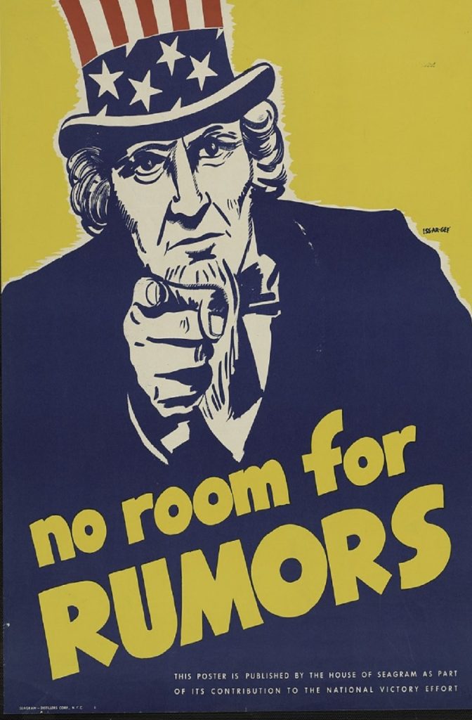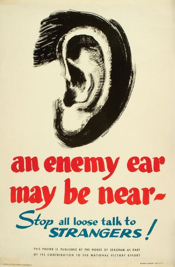 During World War II the Seagram Company, then headquartered on Lexington Avenue in New York City inserted several obvious concepts into the national dialog of Americans. They called their actions a contribution to the National Victory Effort. What they wanted was for people to use common sense. The campaign was to have those who knew war-secrets to stop talking about the war in ways that could undermine the war effort.