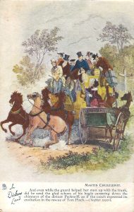 If biographical information on “Kyd” and Harold Copping is scarce, such certainly is not the case for “Phiz.” Hablot Knight Browne (born 1815, died 1882) was selected by Dickens himself to illustrate the novels from his own “verbal descriptions.” Their association continued from The Posthumous Papers of the Pickwick Club in 1837 through A Tale of Two Cities in 1859. Tuck apparently simply obtained the rights to reproduce some of these drawings on cards. Although these sets certainly appeared as early as 1905 with the regular Oilette back, some of the sets were reprinted for the Dickens Centenary in 1912 and bear a special imprint on the back. In some instances, the coloring of the regular Oilettes and the Dickens Centenary cards is quite different although the designs are the same. The “Phiz” illustrations, originally black and white engravings etched on steel plates, were apparently colored for their appearance on the Tuck cards. They are sharply delineated sketches with a heightened sense of caricature.