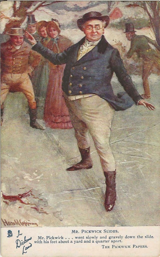 Some of the Copping paintings appeared on Tuck’s Dickens calendars as early as 1908 although the books containing them were not published until the 1920s and 1930s. Most of the Copping cards bear the Arms of the Prince of Wales, indicating that they were printed sometime between 1911 and 1936. Various backs testify to numerous reprintings.