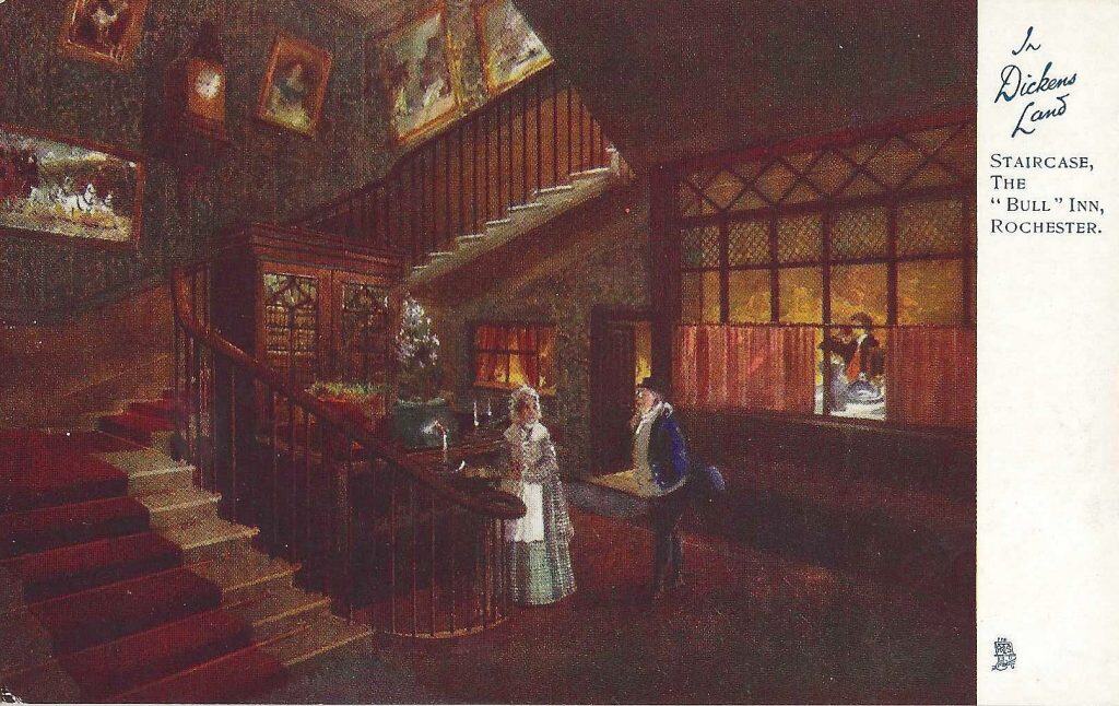 The Copping cards bear the full signature and the majority of the “Phiz” cards carry either the scrawled pseudonym or the line “After the picture by ‘Phiz’, despite the fact that all were originally published as illustrations to the various novels and stories before appearing on cards. There are, in addition, three sets (“In Dickens Land”—1163, 1164, and 1350) which portray scenes from the novels, of Gadshill (Dickens’ home), or English views associated with Dickens. One other set in the Tuck Aquarette series (6271) shows scenes from Rochester which figured in the novels. This is signed S. Aveling.