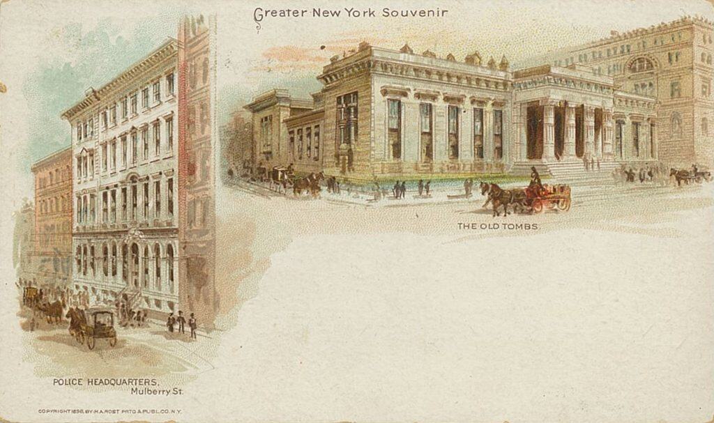 From the start, the highly collectable neighborhood Police stations are depicted as local and accessible. This Private Mailing Card lithograph by Rost shows Mulberry Street Police Headquarters. Several blocks away “The Old Tombs” is where the failures were sent, that is the county prison. Even though several successively larger buildings have occupied this location for the same purpose, it’s still known as “The Tombs.