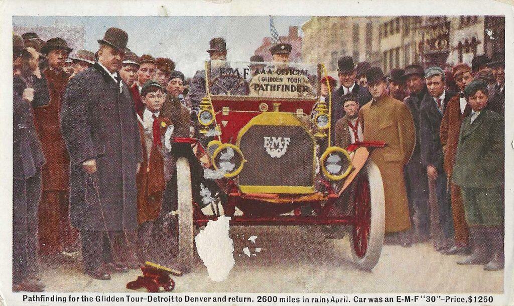 Two sets of color postcards of the Glidden Tours are known: the Flanders “20” Set, and the E.M.F. “30” set. The older of the two sets dates from the 1909 Detroit, Michigan to Denver, Colorado and return to Kansas City, Missouri. An estimate by an experienced collector hints that the set has 20 issues, illustrating the start of the event and continuing along roadsides in Michigan, Wisconsin, Minnesota, Colorado, Kansas, and Missouri.