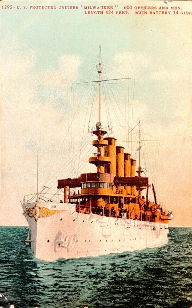USS Milwaukee never saw serious action, nor was it involved in battle. She was built at the Union Iron Works in San Francisco, California and was commissioned on December 10, 1906. The ship’s log is consistent with details of guarding the west coast and transporting naval militia from the west coast to Hawaii. Eventually she was assigned to duty as a tender to destroyers and submarines of the Pacific Fleet, based in San Diego, California.