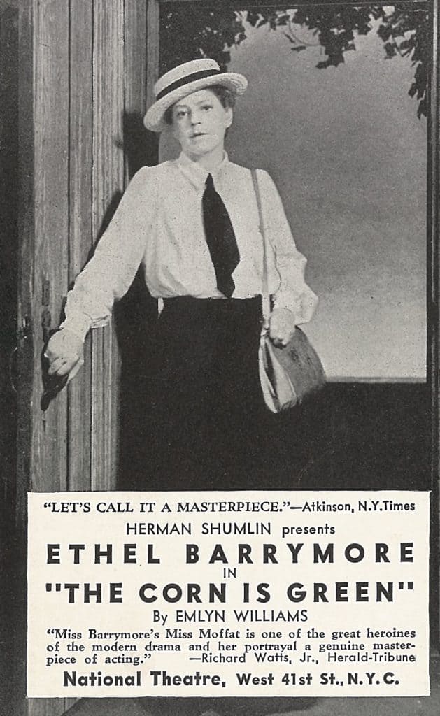 In 1940, Ethel Barrymore, the doyenne of Broadway veterans was induced by the gifted and imaginative upstart producer Herman Shumlin to cap her 50-year career as Miss Moffat in The Corn Is Green. The role of a hardened Welsh schoolteacher who softens and regains her optimism working with a promising apprentice helped Barrymore demonstrate the range and depth of an authentic master. Afterwards, her career became legendary in both stage and screen until her death in 1969.