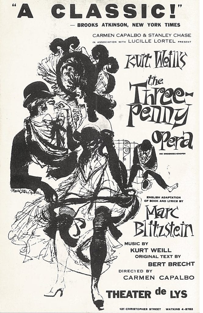 Theater de Lys, which eventually became named for actress and innovative play producer Lucille Lortel. The renaming followed her grandly successful revival of the Weimar Republic’s sensation, Kurt Weill’s The Three-penny Opera. Circle in the Square, after many years of producing “theater in the round” on Sheridan Square and Bleecker Street, has finally moved uptown to the Broadway theater district. The Cherry Lane Theater remains a committed stalwart in its original location on Commerce Street snagging kudos as New York’s longest running Off-Broadway theater. It boasts an unparalleled record of having produced the works of leading playwrights including Dos Passos, Fitzgerald, and Elmer Rice in the ’20s to O’Neill, O’Casey, Odets, Auden, Gertrude Stein, T.S. Eliot and William Saroyan in the ’40s and ’50s to Beckett, Albee, Pinter, Ionesco, and LeRoi Jones in the ’60s to Sam Shepard, Lanford Wilson, Jean-Claude van Itallie, Joe Orton, and David Mamet in the ’70s and ’80s