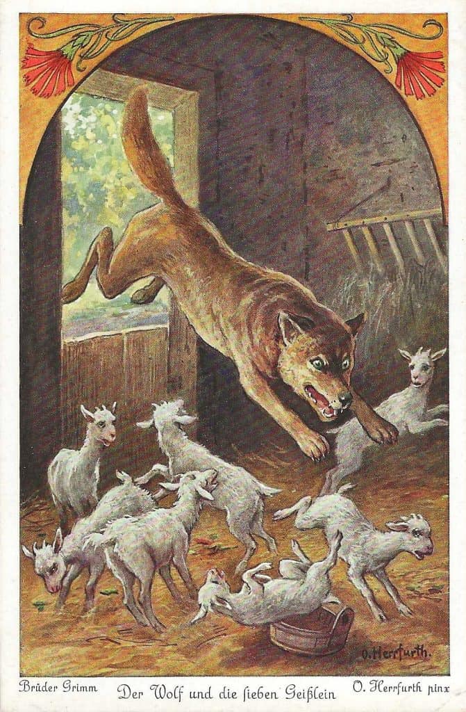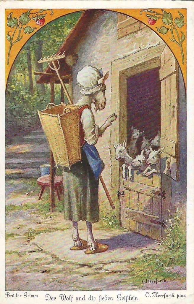 Once upon a time there was a mother goat. She had seven little kids, and loved them all, just as a mother loves her children. One day she wanted to go into the woods to get some food. So she called all seven to her and said, “Children dear, I am going into the woods. Be on your guard for the wolf. If he gets in, he will eat up all of you, even your skin and hair. The villain often disguises himself, but you will recognize him at once by his rough voice and his black feet.”