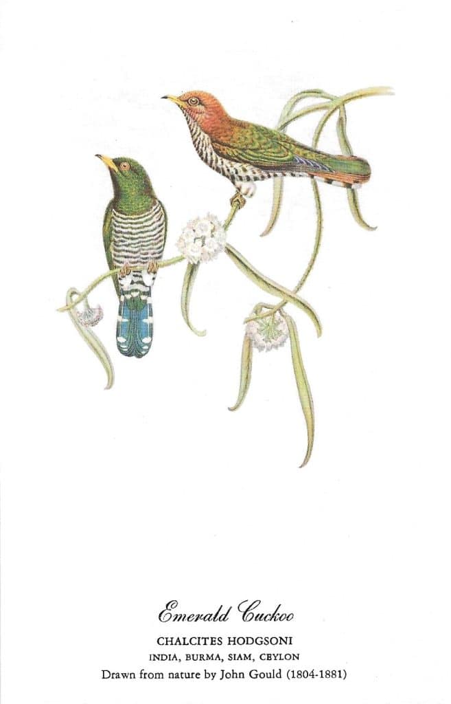 I noticed that of the four countries identified as the range of the emerald cuckoo, only India is still known by that name. Burma is now Myanmar, Siam became Thailand, and Ceylon was replaced by Sri Lanka.