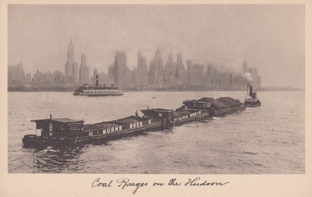 Anthracite coal was transported from Pennsylvania via the 108 milelong Delaware and Hudson Canal to Kingston, New York on the Hudson River, and then to New York City and Albany. Another Max Jaffe half-tone collotype card from the 1930s shows some of these coal barges on the Hudson River, south of Battery Park at the southernmost tip of Manhattan Island.