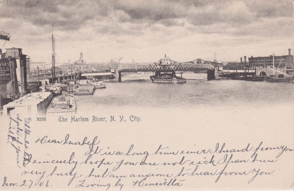 Barges on the Hudson, East, and Harlem Rivers supplemented railways, roads, and bridges by helping to deliver goods to the New York City boroughs. A circa 1906 Rotograph Company postcard shows some of these barges tied up along the Harlem River.