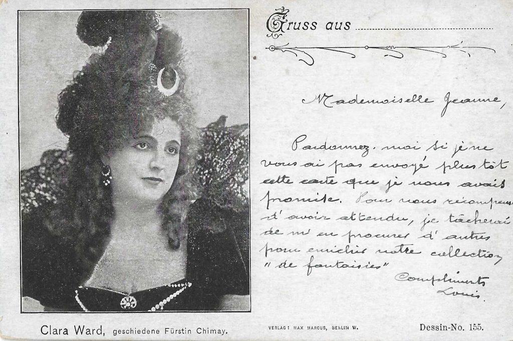 She: The Princess of Caraman-Chimay, a fancy title for the simple Clara Ward, the star-blessed daughter of a Detroit lumber, steel, and railroad magnate, rich enough to buy his way into Belgian royalty with a well-selected, though relatively impoverished mate for his daughter. Her beauty was sufficiently notable that despite being a bride at 16, the great chef Escoffier named dishes after her and Kaiser Wilhelm II banished the production of her image on German postcards and photographic media.