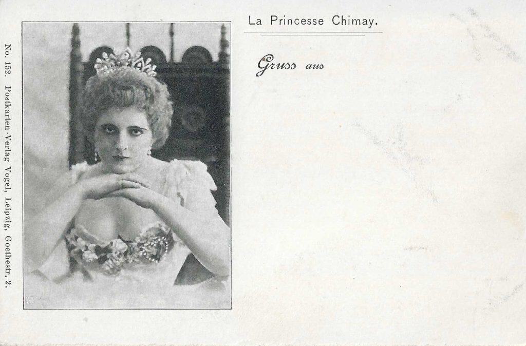 The Princess’ art-form was called poses plastique in which she struck a range of erotic and futuristic poses while wearing skin-tight, flesh-colored revealing fabric costumes. Postcards here show several examples of her performance art, one a tight outfit through which onlookers reportedly could feel the warmth of her flesh. The other, an ensemble with stars leading to imagination about space travel and the future. The possibilities seemed endless.