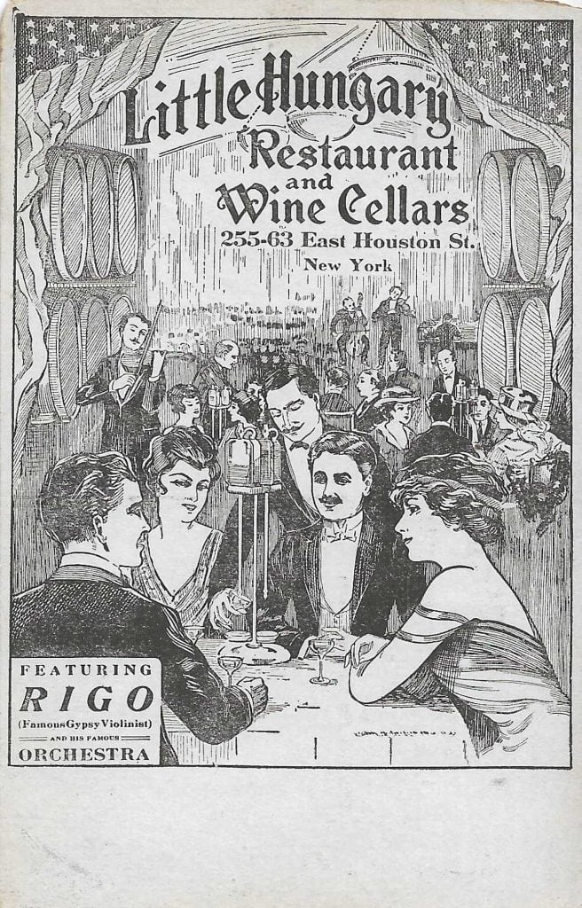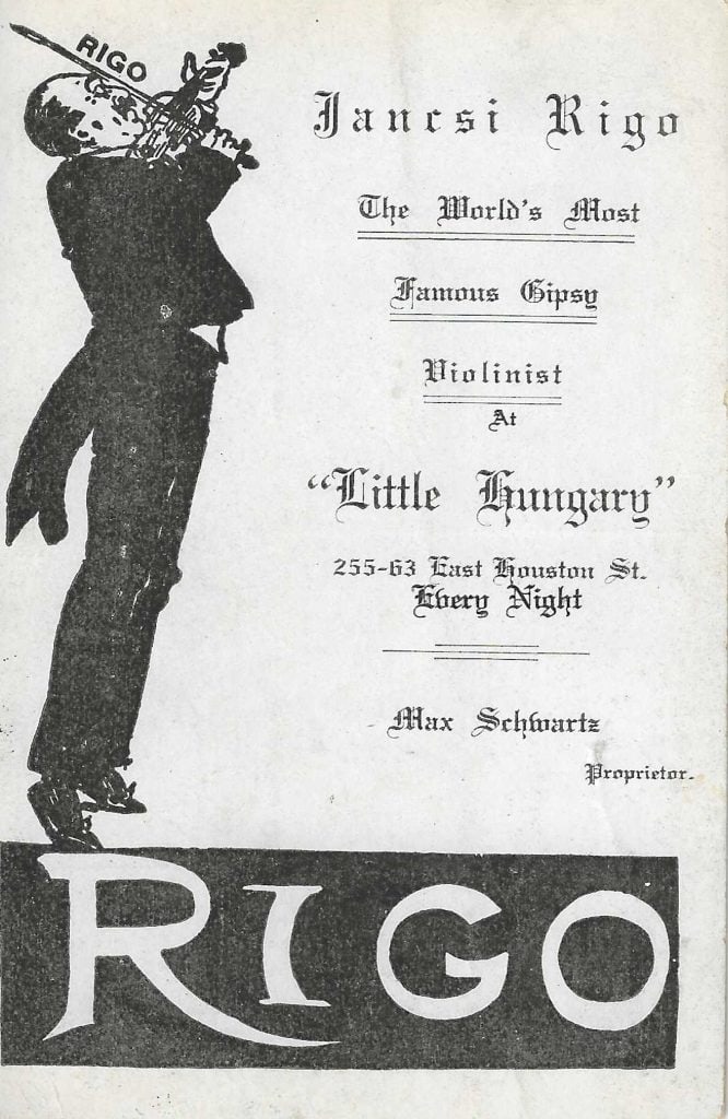Rigo appeared in New York frequently at nightclubs like Churchill’s in Times Square and Little Hungary on the Lower East Side, which promoted and memorialized his appearances by publishing postcards. He died in 1927.