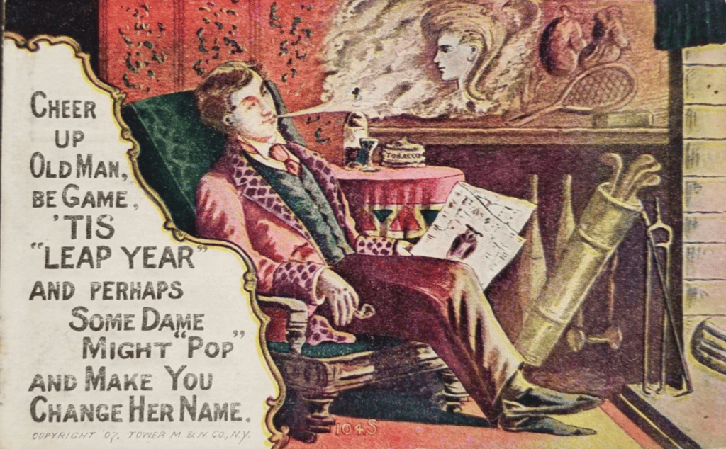 In the postcard world, at least fourteen publishers created Leap Year sets that were very popular and profitable. Some of the publisher’s names you will recognize at once: Gabriel, the Illustrated Postcard Company, E. Nash, The Rose Company, Tuck, and Ullman. The names of the artists are equally familiar: Dwig, Thackeray, Curtis, and several sets that were published without an artistic credit. So, it goes without saying that Postcard History should offer our readers a history of leap year cards.