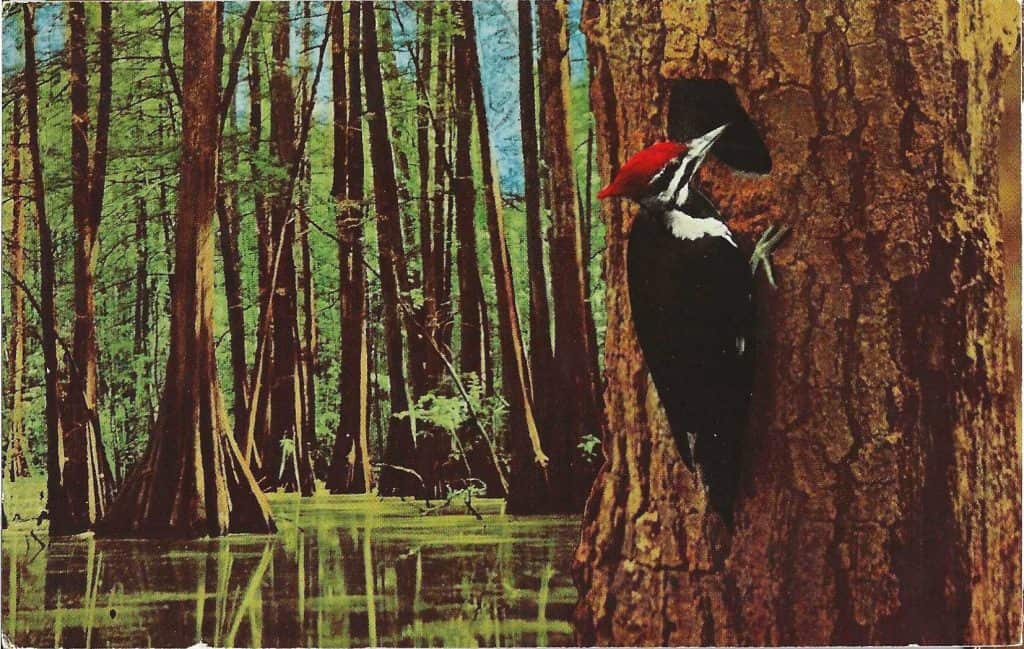 Left: the Ivory-billed Woodpecker may be one of the rarest, if it still exists. In the last sighting, circa 2016 there were less than a hundred remaining in the swamps of Louisiana, primarily in the Mississippi River delta. Right: named for its hairy crest, the Pileated Woodpecker is commonly found in densely wooded areas where lumbering is threatening their habitats. The Pileated Woodpecker is one of the largest, with a wingspan of nearly 30 inches.