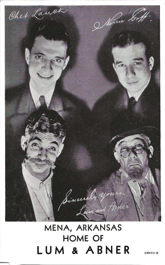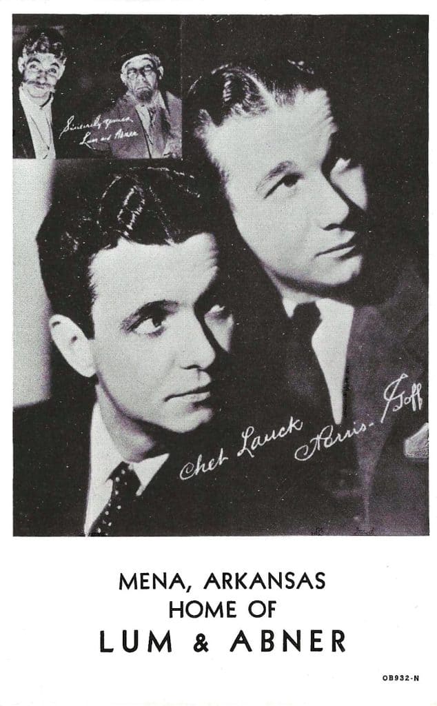 Goff and Lauck met at the University of Arkansas and remained friends the rest of their lives. Goff was a radio actor, who played Abner Peabody in the famed Lum and Abner radio comedy and later television program; and Chester “Chet” Lauck, was the other half of the Lum and Abner comedy pair. Lauck played Columbus “Lum” Edwards.