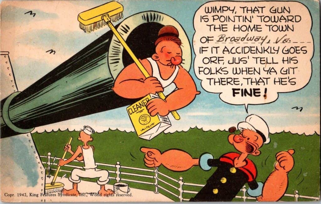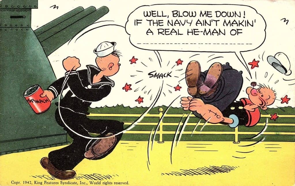 I loved popeye . When I was a kid my father was in the merchant marines. When home,id be on his lap watching Popeye cartoons & of course “The three stooges. My favorite line in cartoondom was Popeye &. olive out in the ocean in a bad storm, & Popeye says ” Large weather we’re having Olives”.!!¡!. To this day, when a bad storm or hurricane is here…….thats my statement for seventy years!