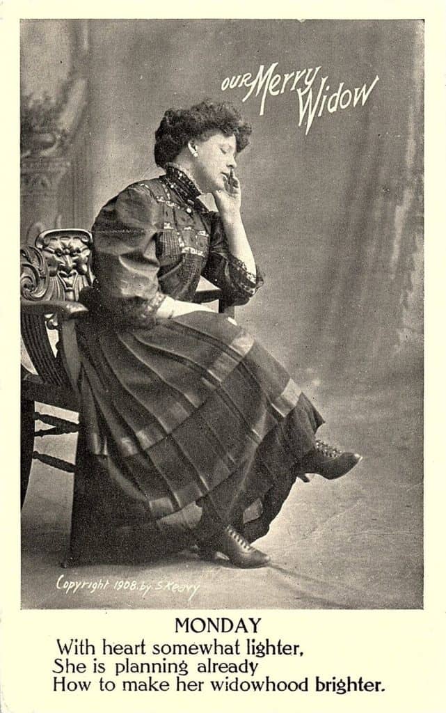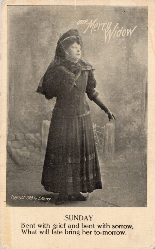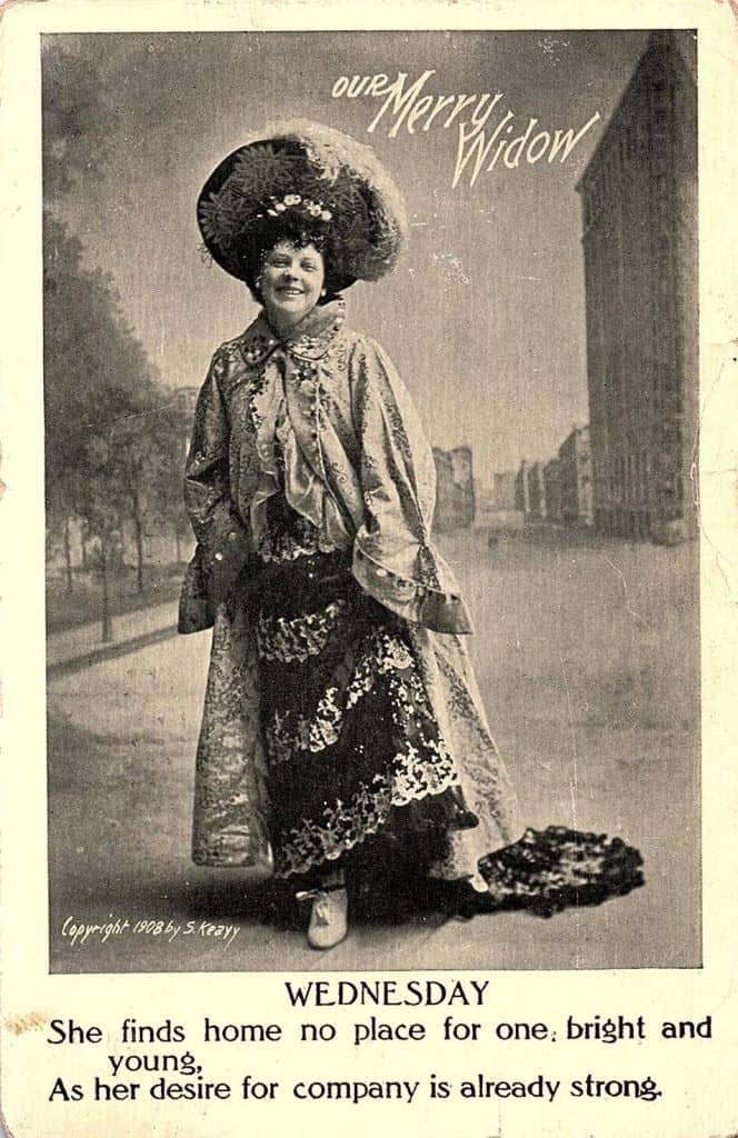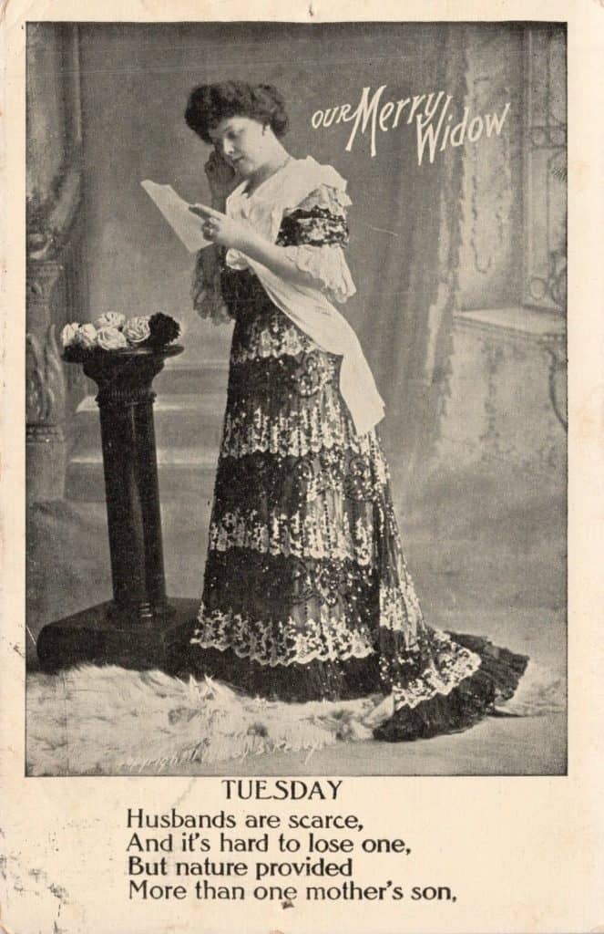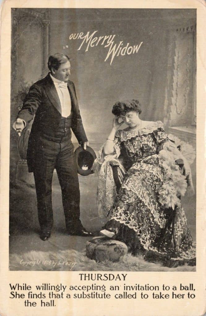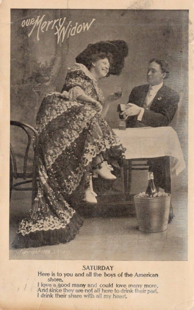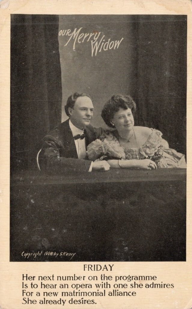 It may be that postcards were the most effective means of advertising theatre in the early twentieth century. In one collection that was started around 1990, at last count, there are 41 cards with a “Merry Widow” theme. Seven of those cards are a “Day-of-the-Week” set.