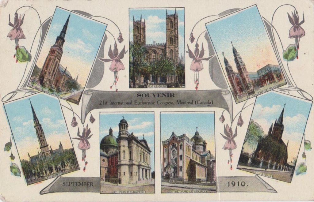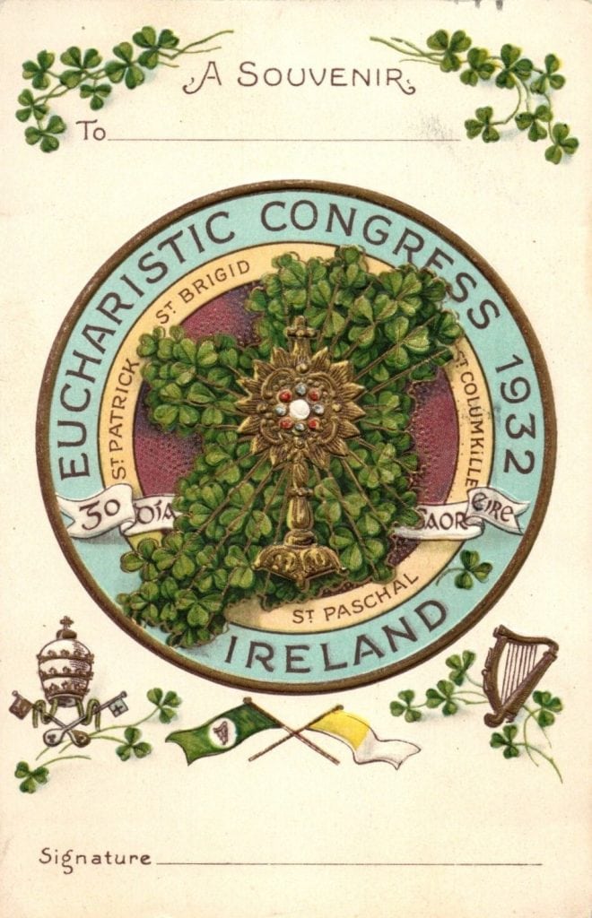 Above: other cards from the 1932 congress in Dublin showing the River Liffey Bridge in Dublin and from the Montreal event of 1910 showing famous Catholic leaders of the era.