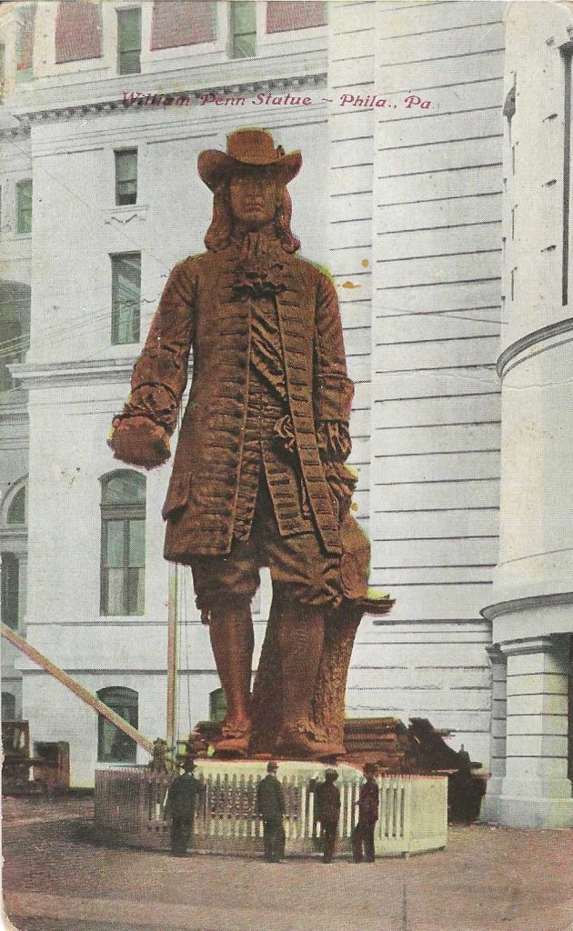 Calder cast the pieces circa 1890 and completed its construction in 1892. After being transported to the city hall at Broad and Market Streets, it waited in pieces until the morning of Wednesday November 18, 1894. With thousands of spectators present, the steel framework and 53,000 pounds of bronze plates were hoisted to the top of the City Hall Tower and assembled into the 37-foot-tall statue. The work was designed without thought of orientation, but someone decided it should face Penn Treaty Park.