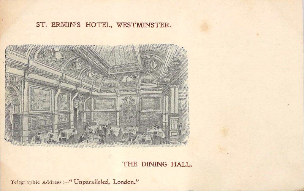 Other postcards of the St. Ermin’s Hotel are found in most dealer’s London inventory, but aside from this set, they are few. Good luck if you attempt a search.