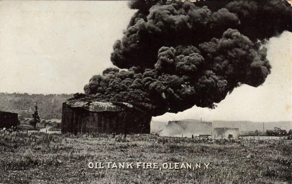 When I found (circa 1991) the postcard of the Olean oil tank fire, my thoughts were that it was an incredibly interesting piece of ephemera, especially when I learned that the public was often invited to watch such disasters unfold. Spectators in their fine clothes were a complete contrast to what they witnessed – presumably, an industrial accident.