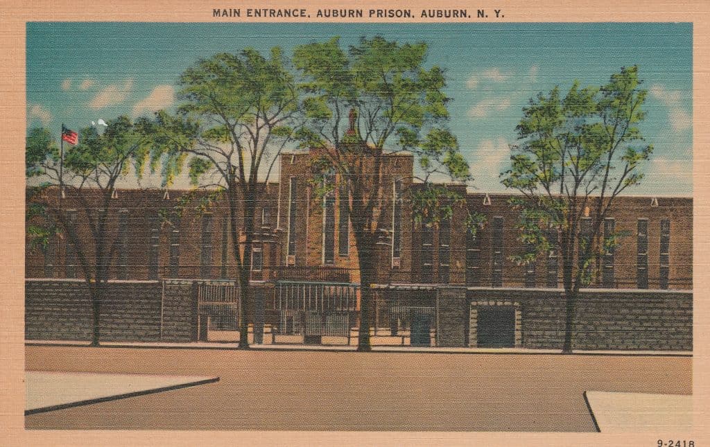 A postcard mailed in July 1917 shows the Women’s Prison in Auburn, New York. With its ivy-covered walls and flowering shrubs, the prison could pass for a building at a women’s college. In 1894, when an asylum for the criminally insane was closed, the state authorized the buildings to be used as a women’s prison. Prior to that female prisoners lived in an attic above the kitchen at the men’s prison in Auburn and were fed only once a day.