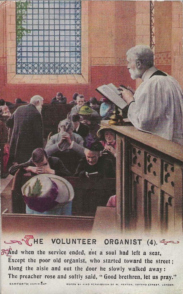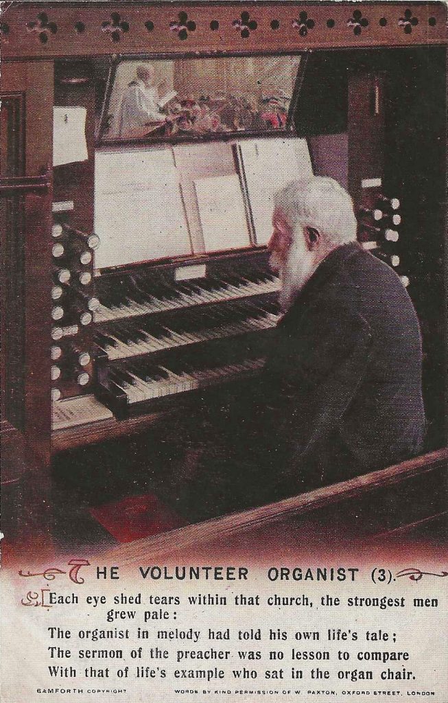 Dawson recorded The Volunteer Organist in 1904 and it was he who made it a perpetual favorite. As a performer, he worked for over fifty years for EMI and HMV (early 20th century record companies.) In the 1920s and 1930s, he was possibly the most popular singer of the era. Once when asked about his recordings, he said, “I have enjoyed my years at the microphone, but when I think of my time at the gramophone, I remember how it was an instrument of torture. It was excruciating for the recording artist, who needed “lungs of leather” to make an impression on those wax cylinders. They captured nothing but the very loudest noises. I was lucky, I could make those kinds of noises.”