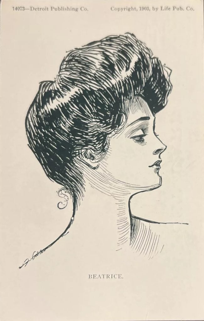 The Women’s Heads series was published twice, once in the U.S. by Detroit Publishing Co. and in Europe by the James Henderson Company in London. It may be that the series was meant to be a 12-card set, but only eleven cards are known. The “Beatrice” card above is the American version. The Detroit cards are part of their “14000 series,” but only eight cards are known. It should be noted that Gibson’s signature is obvious on the British cards but is well hidden on the American cards (look closely at Beatrice’s right shoulder).