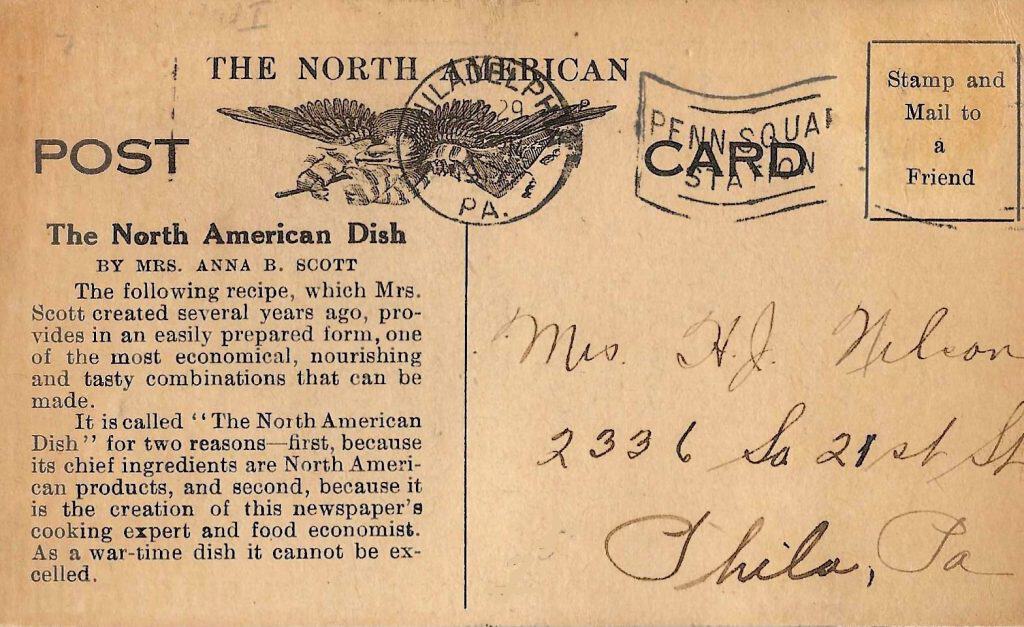 You can see that the message is a recipe for something called “The North American Dish.” The message continues with the information that the recipe was created by Mrs. Anna B. Scott several years ago (apparently prior to 1917) and the result is a “tasty combination.”