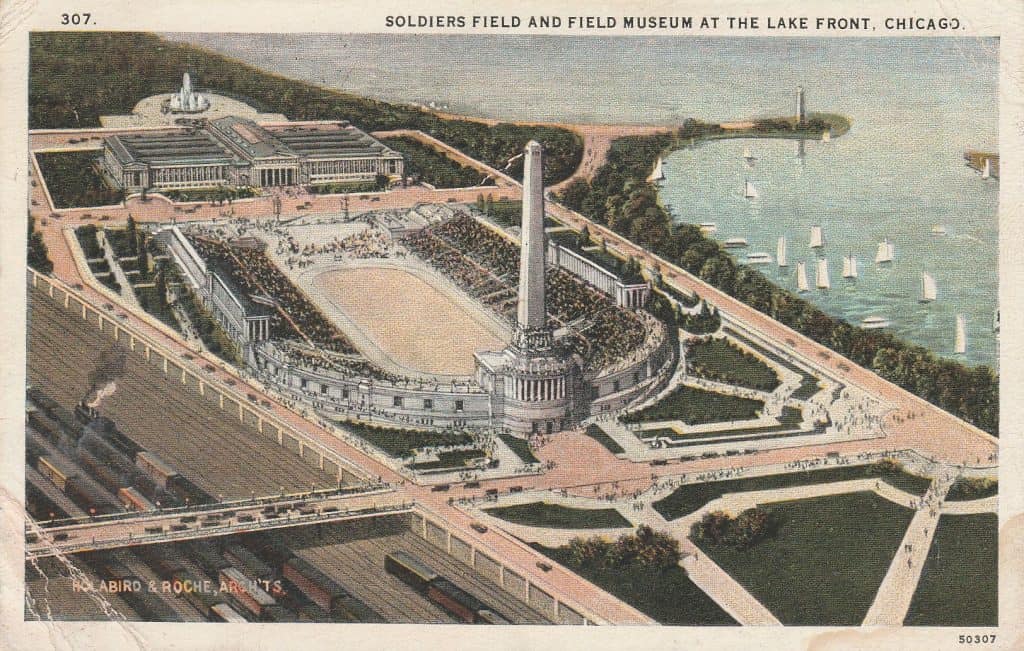 Although not the home field of a college football team, Soldier Field still played an important role in the history of college football. Located in Chicago’s Grant Park on Lake Michigan, Soldier Field was completed in the summer of 1924, and cost $13 million to construct. By comparison, the Los Angeles Coliseum built in 1923 cost only $954,873. It was initially named the Municipal Grant Park Stadium, but the name was changed on November 11, 1925, to honor soldiers who died in World War I. It initially seated 74,000 spectators; seating was later increased to 100,000 with temporary stands.