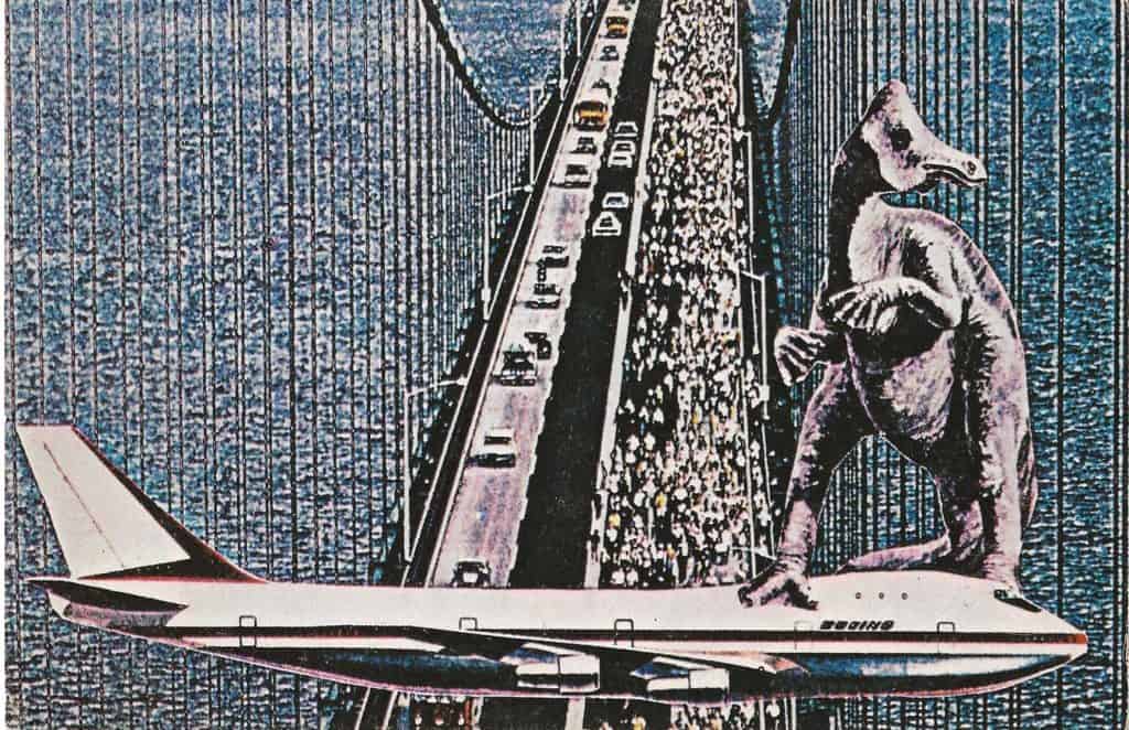 Your dinosaur airplane card reminds me of late 70’s early 80’s punk rock music collage art. Check out art from Winston Smith. He was primarily the album art designer for Jello Biafra & the Dead Kennedys out of the Bay Area.