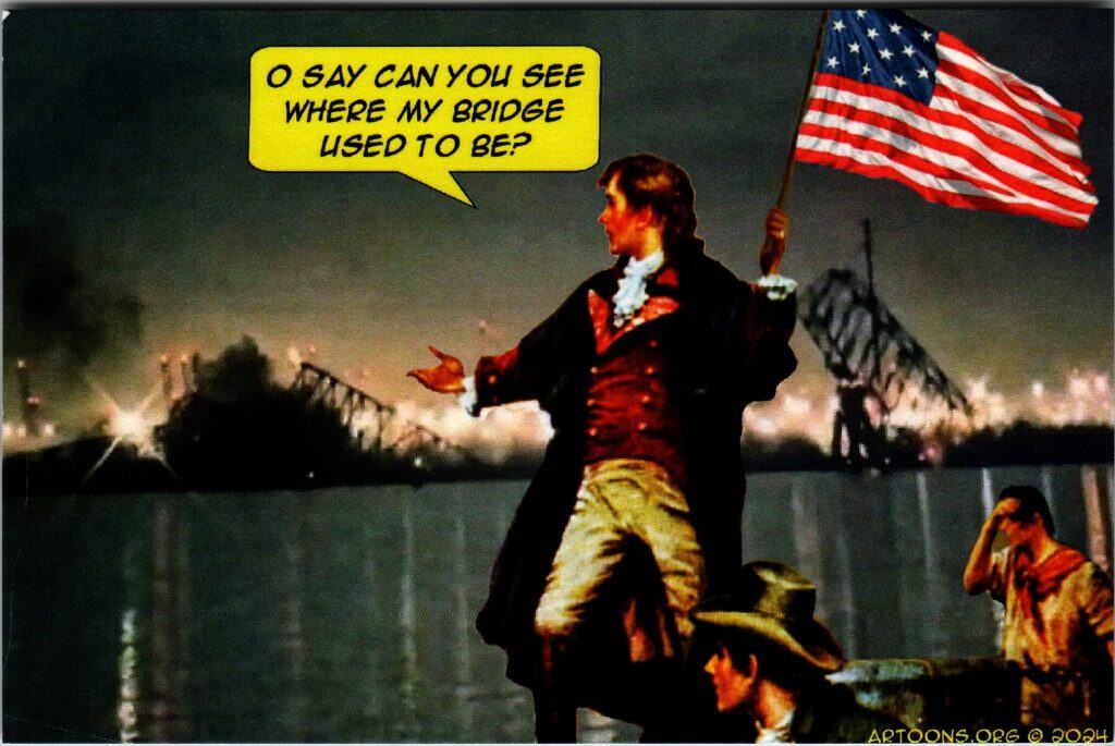 The card with the paraphrase of O Say Can You See, designed by Artoons-org – Redbubble, plays on the name of the bridge and its namesake, Francis Scott Key. Key was the author of a poem written while he was on a ship outside of Baltimore in 1812, that became our national anthem.