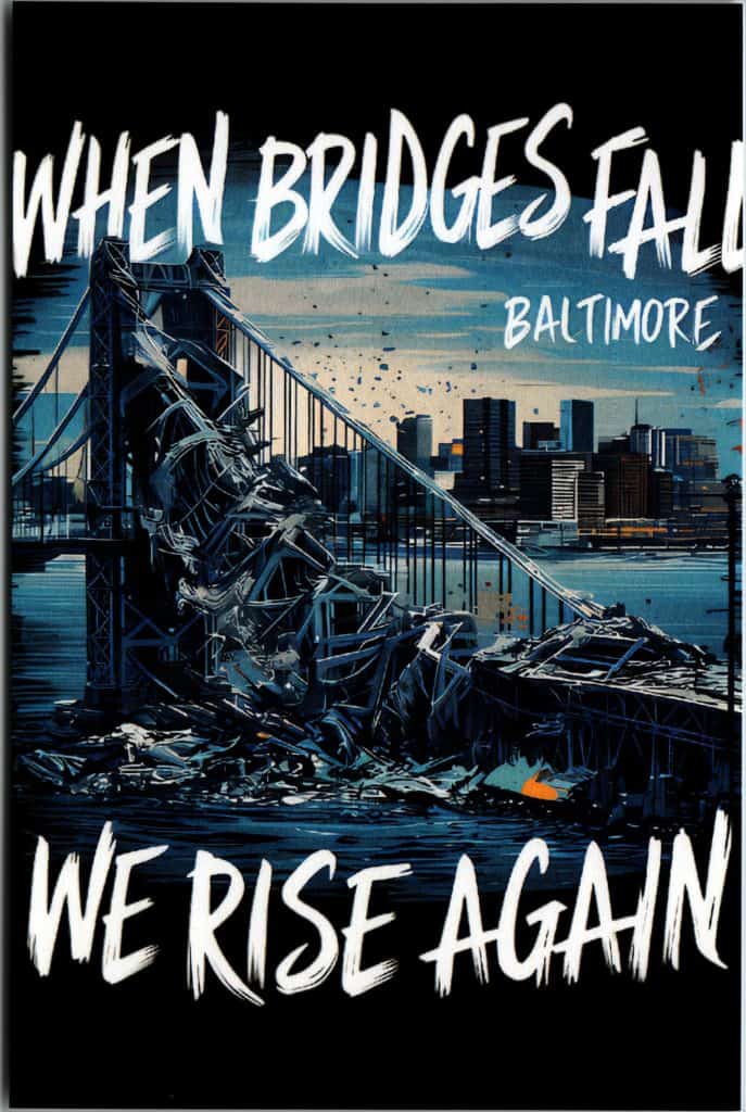 The last category is somewhat bizarre as the artist forgot to check the type of bridge that collapsed. When Bridges Fall, designed by Cainlm – Redbubble is interesting as it is very elaborate and designed by the same artist as RIP Baltimore Bridge, but here the bridge does not look anything like the Key Bridge.
