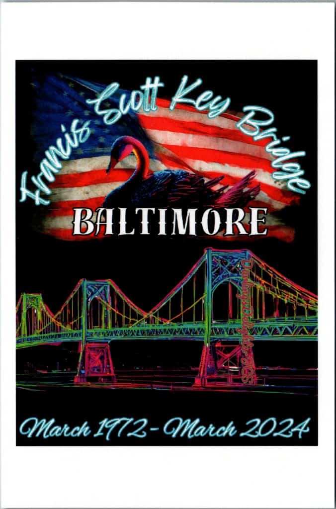 Francis Scott Key Bridge Baltimore, designed by Darlingstees – Redbubble) is quite sophisticated but again the bridge shape is wrong. This artist made a grand effort in the design of this card, but he/she had two major errors, the shape of the bridge and the initial date. The bridge’s permit was approved in June 1972 and as stated above it was opened in 1977.