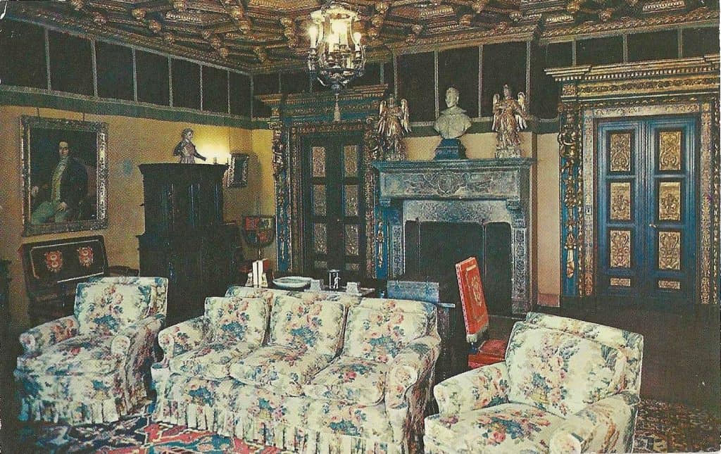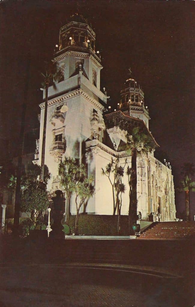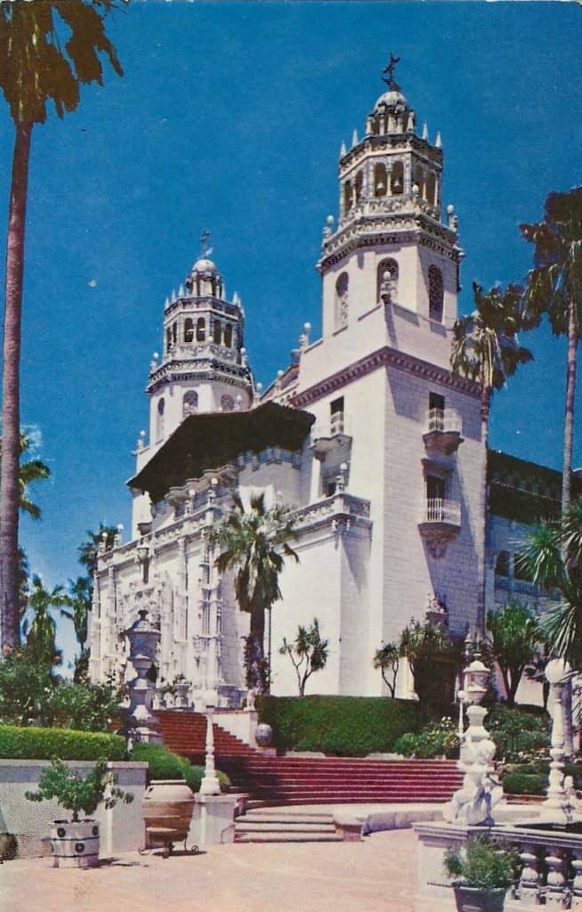 Postcards of San Simeon began to appear in the early 1950s. The castle façade and its interiors, as well as many items in Hearst’s collection were perfect items to be shown on the relatively new chrome postcard. There were probably more than four manufacturers that printed postcards, but four companies made the lion’s share: