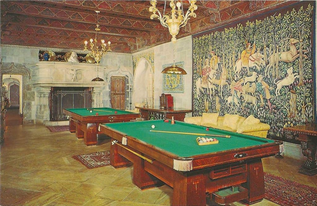 The Billiard Room. The focal point of the billiard room is the late 15th century French tapestry of “Millie-fleur” or a thousand flowers design. The scene depicts a stag hunt well in progress. Game tables repose under a Spanish Gothic ceiling carrying a bullfight theme.