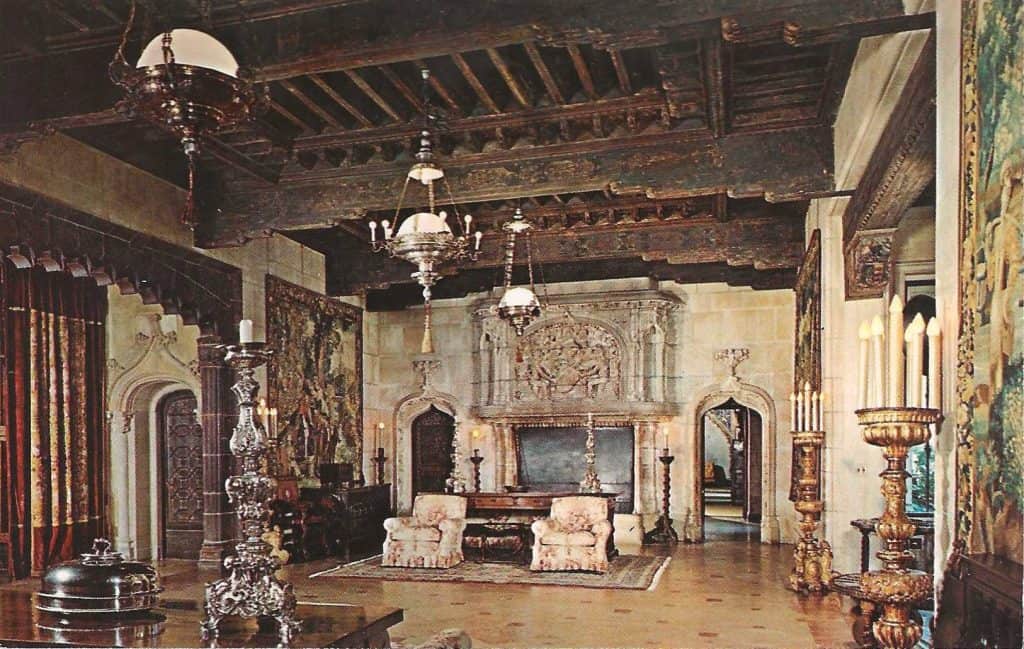 The Refectory. A favorite of Hearst, his refectory successfully marries a variety of architectural elements and superlative furnishings into a medieval yet welcoming whole. Along with lavish silver candlesticks and gold-trimmed “Blue Willow” china his guests used homely condiments in bottles. While eating their eyes could feast on such riches as the 27-foot French gothic fireplace, the gay silk banners from Siena, Italy, and the “Daniel” tapestries.