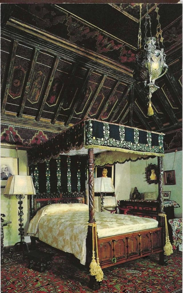 The Gothic Suite. Hearst’s own bedroom is the smallest, but by no means the humblest. Its ceiling, the rarest and most unusual at San Simeon is a 14th century Gothic work from the House of Jews in Tervel, Spain. Above the dresser hands one of the Castle’s most acclaimed paintings, a 14th century gold-laden Madonna by Segma.