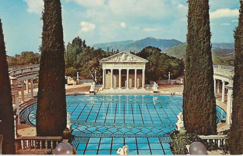 The Santa Lucia Mountains form a dramatic backdrop for the Neptune Pool. Venus, in Carrara marble, gazes across the pool to a Greco–Roman Temple that is pre-Christian in origin.