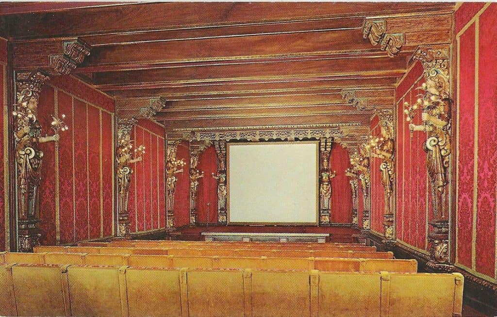 The Theatre is typical of the late 1920s. First run movies were shown here while guests relaxed in the loge seats. Silk damask hangings cover walls between Caryatids, figures that appear to be supporting the ornate beams.