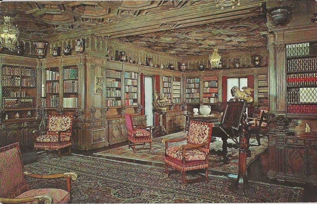 The Main Library in La Casa Grande. Exquisite works of art are displayed along walls and shelves in ornate cabinets. The ceiling is from a 16th century Spanish castle. The holdings include over 4,000 titles and a collection of 150 ancient Greek vases is featured; some are over 2,000 years old.