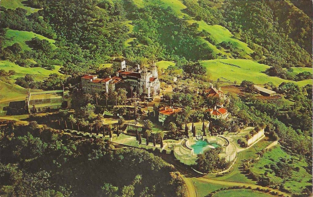 This aerial view of the Enchanted Hill shows the three guest houses and terraced gardens surrounding the La Casa Grande or Hearst Castle. 123 acres of grounds contain statuary, pools, and rare works of art.