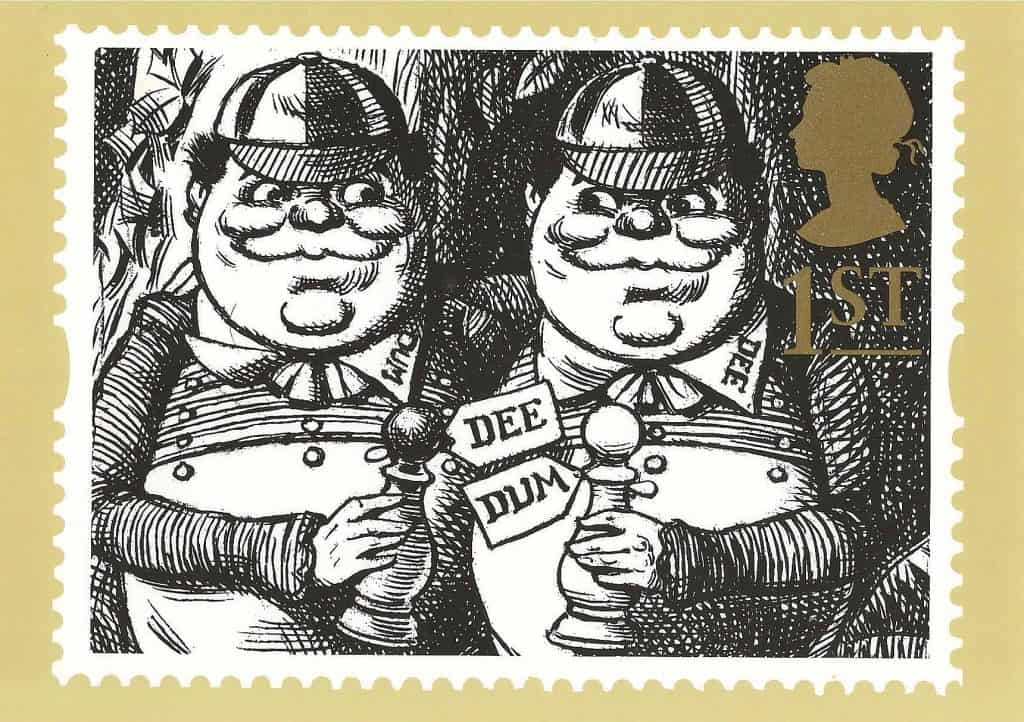 Tweedledum and Tweedledee are characters in Lewis Carroll’s 1871 book Through the Looking-Glass, and What Alice Found There. Their names may have originally come from a ditty written by the poet John Byrom. The names have since become synonymous in western pop-culture slang for any two people whose appearances and actions are identical.