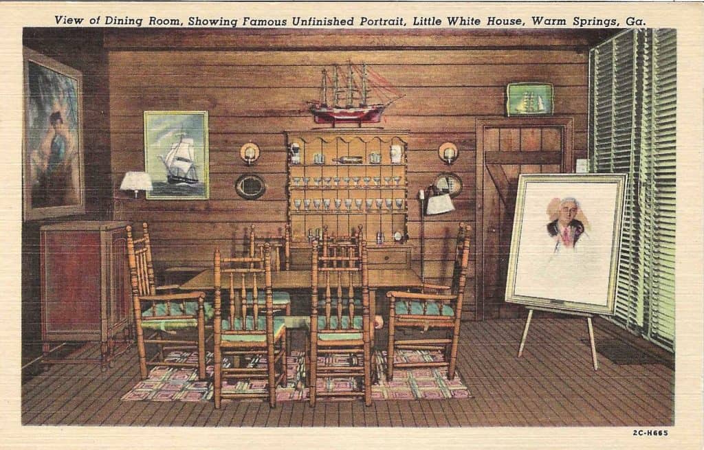 He returned to Warm Springs for the last time in March 1945. Just back from the Yalta Conference, he planned to work on the address with which he would open the United Nations Conference. He also entertained neighbors and conferred with two important guests, Sergio Osmena, the president of the Philippines, to whom he gave assurances of future independence, and Henry Morgenthau, secretary of the treasury. On that Thursday, he planned to attend an afternoon barbecue given by his Warm Springs friends and then a minstrel show at the hospital. Unfortunately, Mr. Roosevelt’s day was interrupted by a massive stroke as he sat in his favorite chair near the fireplace, posing for his portrait. He was carried from the room into his bedroom, he died later that same afternoon. The “Unfinished Portrait” is on exhibit at the Little White House.